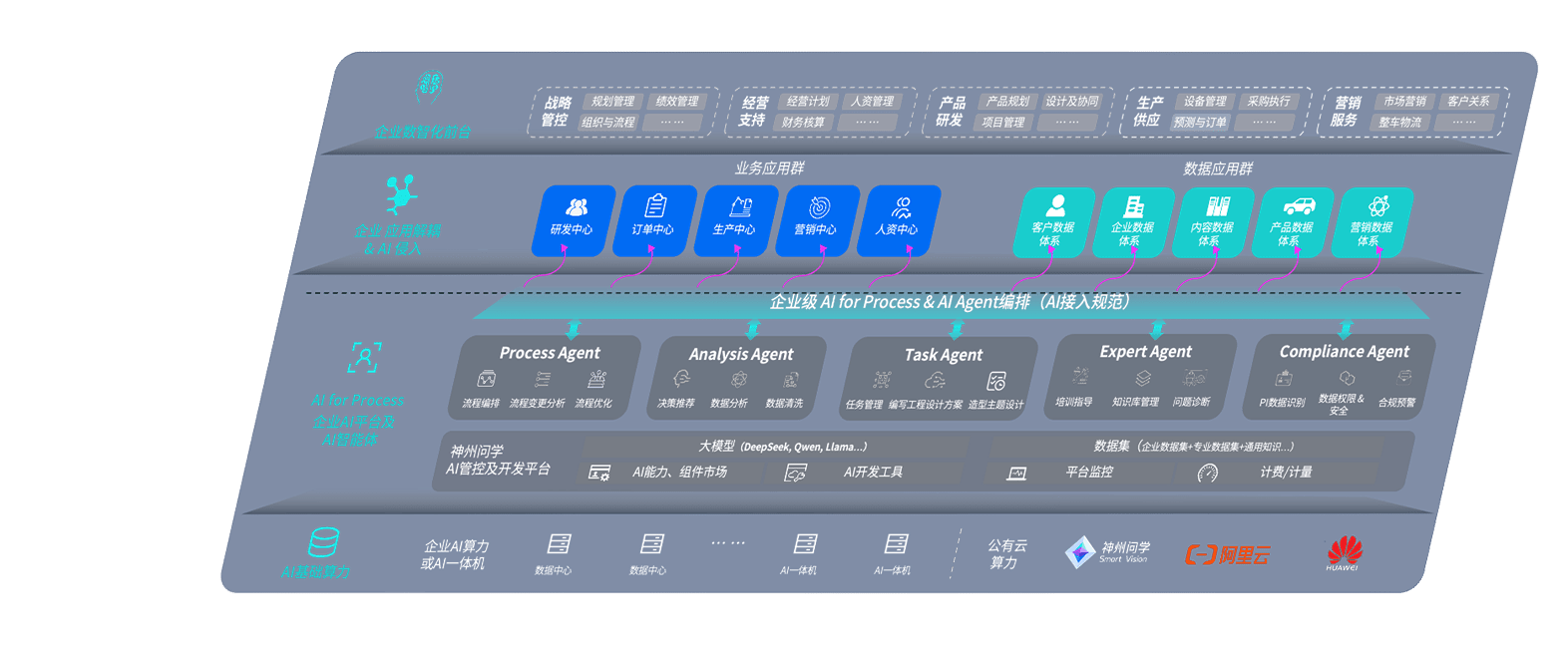 端到端的一站式AI工作空间深度融合了从企业战略规划到日常经营的全流程业务板块,,定向解决车企内部领域多、、、部门多、、、链条长、、场景碎片化等难题,,支持车企快速构建以AI为核心的生产力写作体系,,,,实现任务执行与AI能力的无缝集成与交互