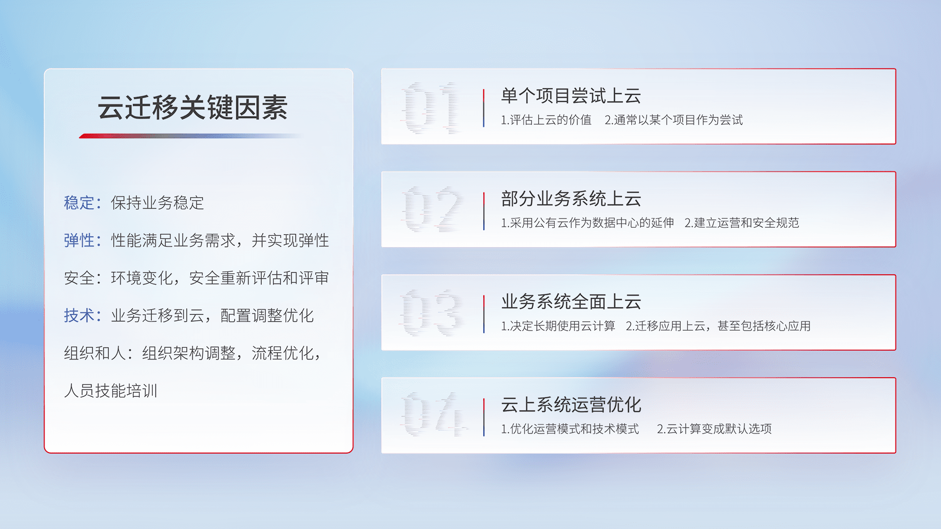 结合实际业务,,,,从规划设计、、、、云平台选型、、、、云原生改造、、、数据迁移、、集成交付,,迁移全过程为客户识别最佳上云路径,,,做好风险识别管理,,设计网络架构、、、、身份权限、、、、安全审计合规、、、、操作审计、、日志审计、、、、监控告警策略、、、、多站点容灾设计等,,,,对云上基础设施进行整体规划,,,,提升IT治理水平,,以满足弹性、、、、高可用、、、高性能的需求。。