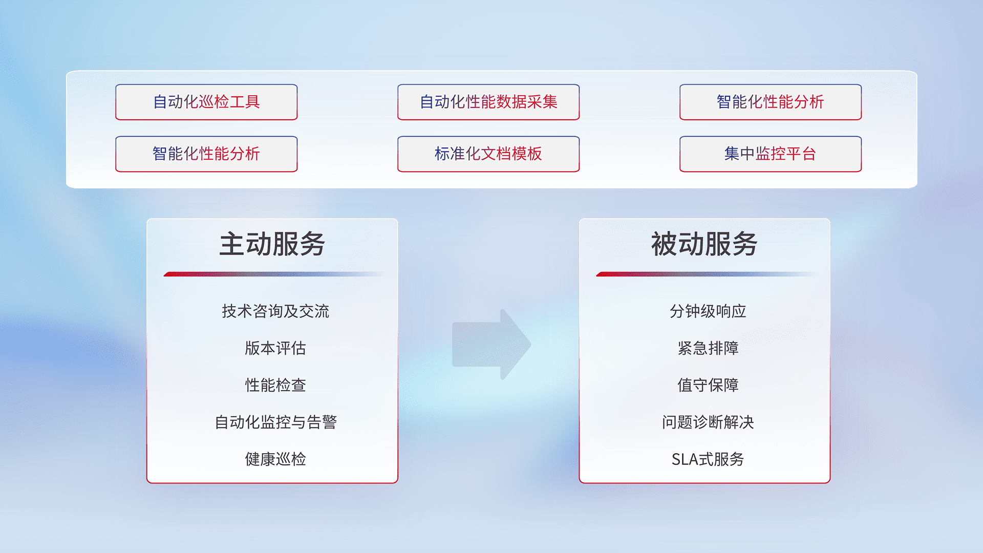 智能化工具和标准化文档,,,保障服务质量,,,,提供主动服务(包含技术咨询、、版本评估、、性能检查、、自动化监控与告警、、、健康巡检)和被动服务包含(分钟级响应、、、、紧急排障、、、值守保障、、问题诊断解决、、、SLA服务)。。。。